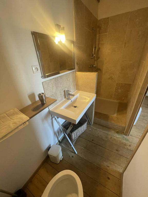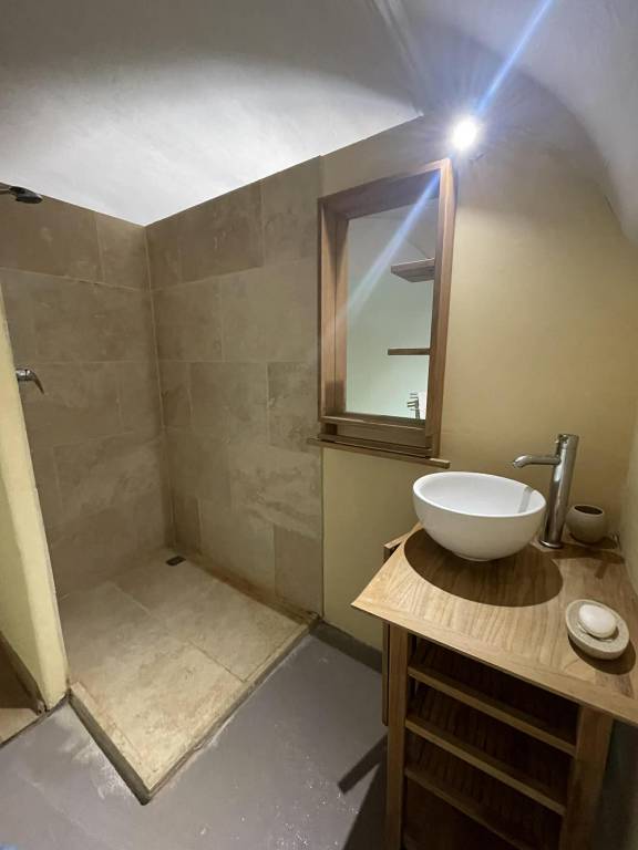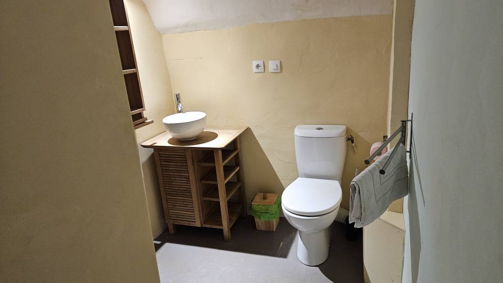 On the ground floor you will find a spacious living-room (with exposed stone walls, an original fireplace framed and TV ), a fully equipped dining-room/kitchen with vaulted ceilings (5.40m high) . There are 2 bedrooms, each with its own shower and toilet, one with a double bed (140cm) and the other with 2 single beds (90cm).
